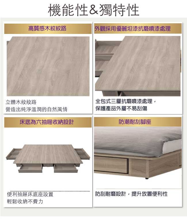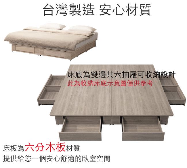 商品 介紹 | 【綠家居】查德 6尺雙人加大貓抓皮革六抽床底(二色可選+不含床墊) 二色可選+現代簡約風格+安心材質製造,整體採用防蛀木心板+六分木床板+防潮耐磨腳座等安心材質製造,產品外層採用防潮耐磨噴漆處理搭配採用可掀式床枕板+內&外開放層格+便利插座設置+三邊開合六抽屜床底等收納空間設計,全由專人配送到家,專業安心服務,替你省下更多時間! 【商品特色】 二色可選+現代簡約風格+安心材質製造,使用放心+搭配居家更便利 採用防蛀木心板+六分木床板+防潮耐磨腳座等安心材質製造 產品外層採用防潮耐磨噴漆處理 搭配採用便利插座設置+三邊開合六抽屜床底等收納空間設計 此商品不需要DIY組立,此商品為組立後之成品 品質保證、專業設計、貼心服務 全由專人配送到家,專業安心服務,替您省下更多時間 |