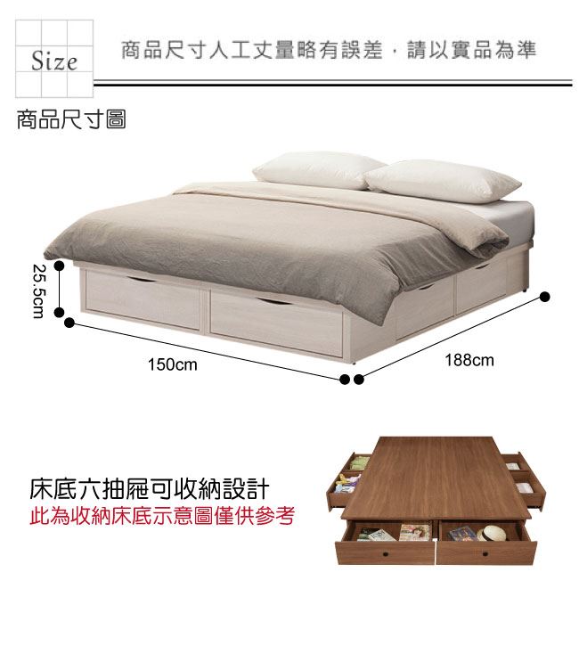 材質 | ◆產品名稱: 【綠家居】提米 現代5尺雙人六抽床底(不含床墊) 產品尺寸: 床底尺寸:(寬)150x(深)188x(高)25.5/公分 ◆材質: 材質:防蛀木心板+六分木床板+防潮耐磨底座 塗漆:優利坦全包式耐磨噴漆處理