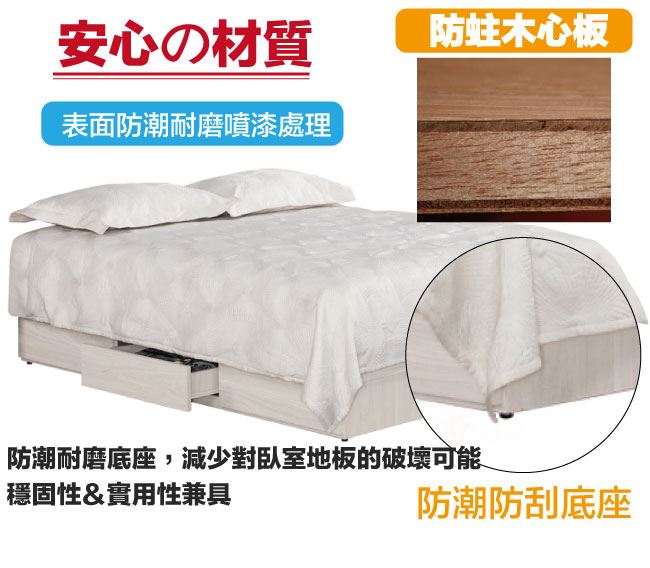 材質 | ◆產品名稱:【綠家居】摩克6尺雙人加大單邊三抽屜床底(不含床墊) 床底尺寸:(寬)181.5x(深)188(高)25.5/公分 ◆材質: 材質:防蛀木心板+六分木床板+防潮耐磨腳座 噴漆:防潮耐磨噴漆處理
