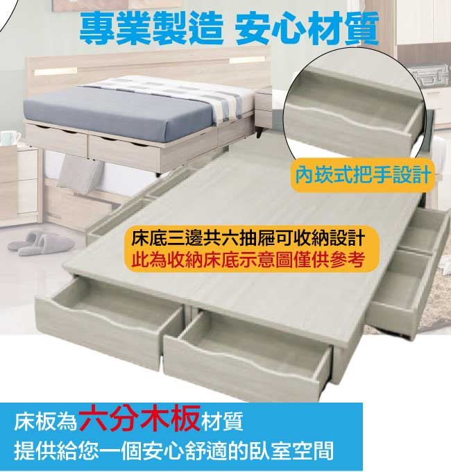 商 品 介 紹 | 【綠家居】布金5尺雙人六抽床底(不含床底+不含床墊) 橡木紋色系+現代簡約風格+安心材質製造,整體採用防蛀木心板+六分木床板+防潮耐磨腳座等安心材質製造,產品外層採用防潮耐磨噴漆處理搭配採用床底三邊開合六抽屜等收納空間設計,全由專人配送到家,專業安心服務,替你省下更多時間! 【商品特色】 橡木紋色系+現代簡約風格+安心材質製造,使用放心+搭配居家更便利 採用防蛀木心板+六分木床板+防潮耐磨腳座等安心材質製造 產品外層採用防潮耐磨噴漆處理 搭配採用床底三邊開合六抽屜等收納空間設計 此商品不需要DIY組立,此商品為組立後之成品 品質保證、專業設計、貼心服務 全由專人配送到家,專業安心服務,替您省下更多時間