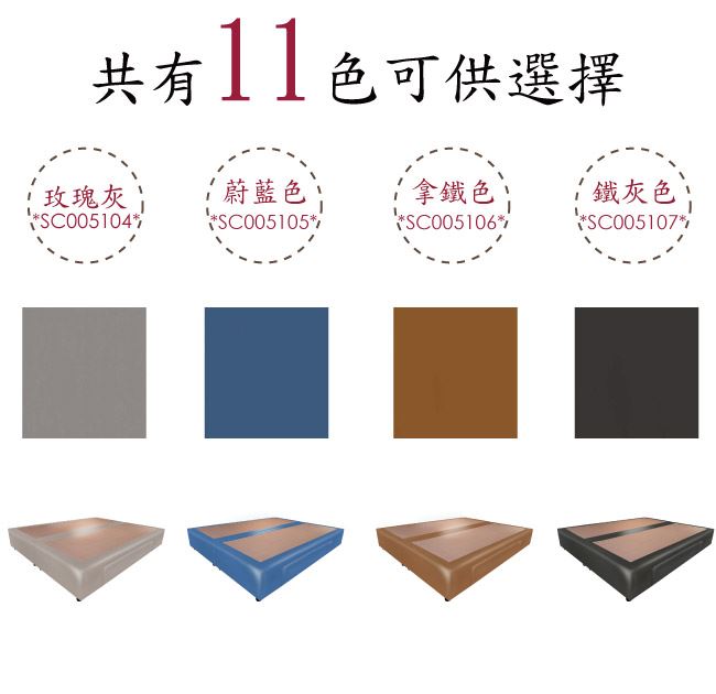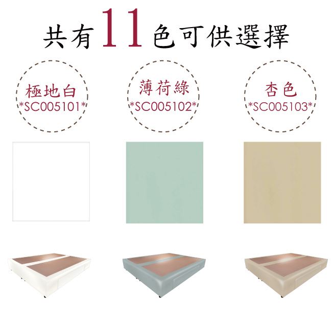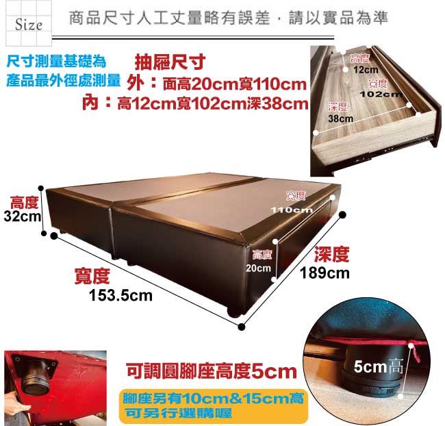 材質 | ◆產品名稱:【綠家居】柯瑞5尺超耐刮皮革雙人二邊二大抽床底(11色可選+不含床墊) 床底尺寸:(寬)153.5x(深)189(高)32/公分 ◆材質: 材質:內置實木骨架&實木材質邊框+黑漆可調圓柱形腳座(5cm高)+國產高科技超耐刮皮革+高密度泡棉+止滑天鵝絨布 備註:1,國內自家工廠製造,採用高標準要求選材備料製造,另可訂製其他顏色喔,歡迎詢問訂製相關事宜 2,床底底部配置的黑漆可調圓柱形腳座另有10cm&15cm高度可洽詢選配 3,選購顏色可參考內文圖片的色系,專人會致電給您做顏色確認,避免顏色認知不同產生爭議 4,本產品屬接單後專人訂製全新產品後安排出貨,接單後備貨製作時間約為3-7個工作天(不含配送時間安排),選購時請您先確. 認可以等待喔!請您見諒!