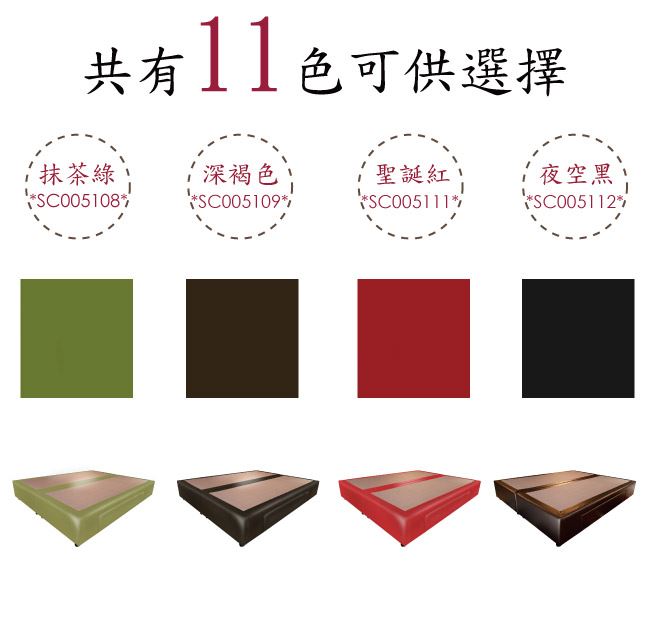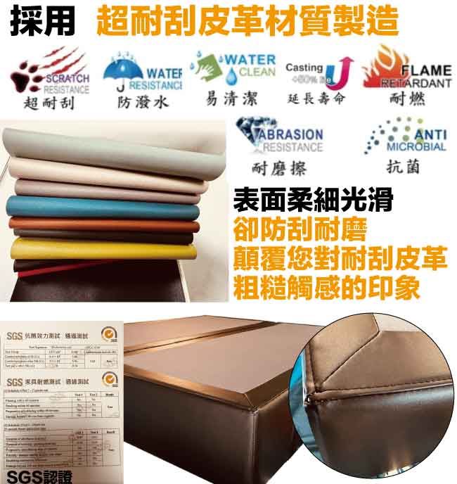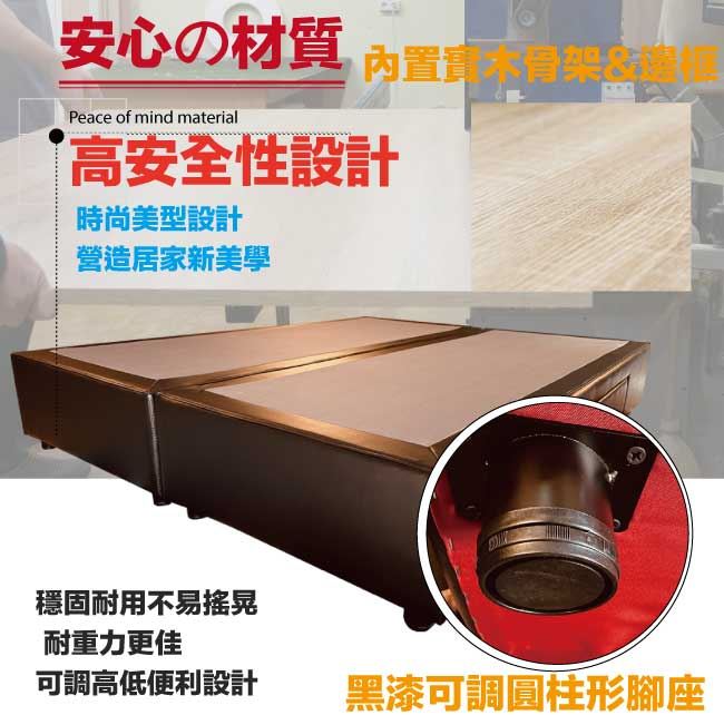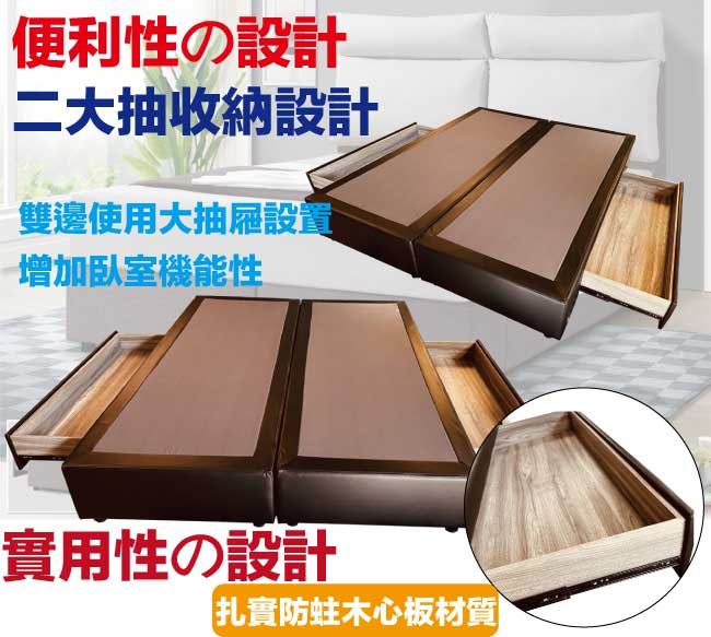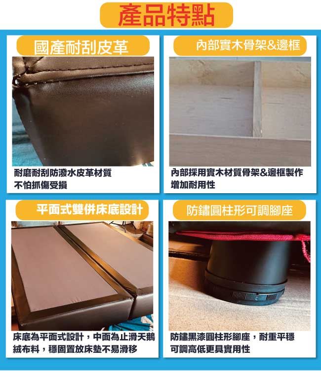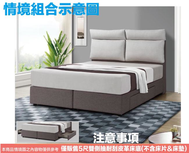 商 品 介 紹 | 【綠家居】柯瑞5尺超耐刮皮革雙人二邊二大抽床底(11色可選+不含床墊) 11色可選+現代簡約風格+安心材質製造,整體採用內置實木骨架&實木材質邊框+黑漆可調圓柱形腳座(5cm高)+國產高科技超耐刮皮革+高密度泡棉+止滑天鵝絨布等安心材質製造,產品外層採用防潮耐磨噴漆處理搭配床底採用床底採用平面式雙床底併合設計搭配止滑天鵝絨布面,可讓床墊平穩置放避免破壞結構,並減少床墊位移的問題,全由專人配送到家,專業安心服務,替你省下更多時間! 【商品特色】 11色可選+現代簡約風格+安心材質製造,使用放心+搭配居家更便利 採用內置實木骨架&實木材質邊框+黑漆可調圓柱形腳座(5cm高)+國產高科技超耐刮皮革+高密度泡棉+止滑天鵝絨布等安心材質製造 床底採用床底採用平面式雙床底併合設計搭配止滑天鵝絨布面,可讓床墊平穩置放避免破壞結構,並減少床墊位移的問題 床底抽屜為雙邊二大抽屜收納設計,搭配內崁式拉合開合設計,讓您擁有時尚美型家具收納機能的完美組合 此商品不需要DIY組立,此商品為組立後之成品 品質保證、專業設計、貼心服務 全由專人配送到家,專業安心服務,替您省下更多時間 備註:1,國內自家工廠製造,採用高標準要求選材備料製造,另可訂製其他顏色喔,歡迎詢問訂製相關事宜 2,床底底部配置的黑漆可調圓柱形腳座另有10cm&15cm高度可洽詢選配 3,選購顏色可參考內文圖片的色系,專人會致電給您做顏色確認,避免顏色認知不同產生爭議 4,本產品屬接單後專人訂製全新產品後安排出貨,接單後備貨製作時間約為3-7個工作天(不含配送時間安排),選購時請您先確 認可以等待喔!請您見諒!