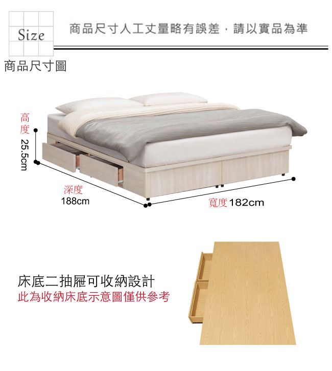 材質 | ◆產品名稱:【綠家居】亞卡6尺雙人加大二抽床底(不含床墊) 床底尺寸:(寬)182x(深)188(高)25.5/公分 ◆材質: 材質:防蛀木心板+六分木床板+防潮耐磨腳座 噴漆:防潮耐磨噴漆處理