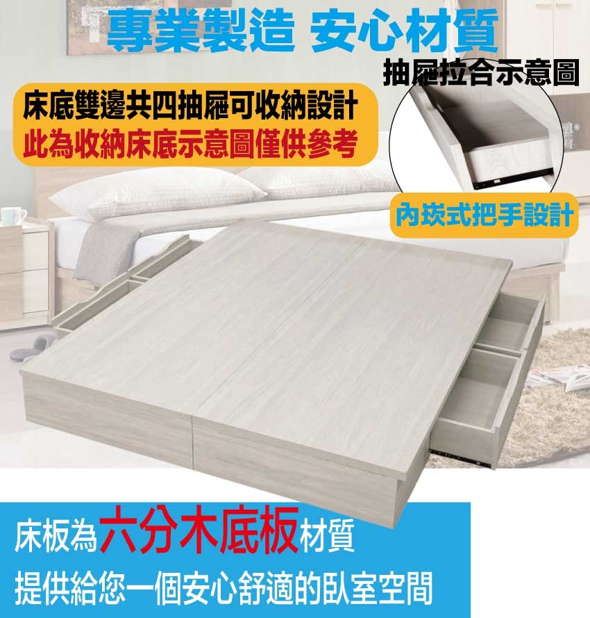 搭配床底採用雙邊開合四抽屜收納空間設計