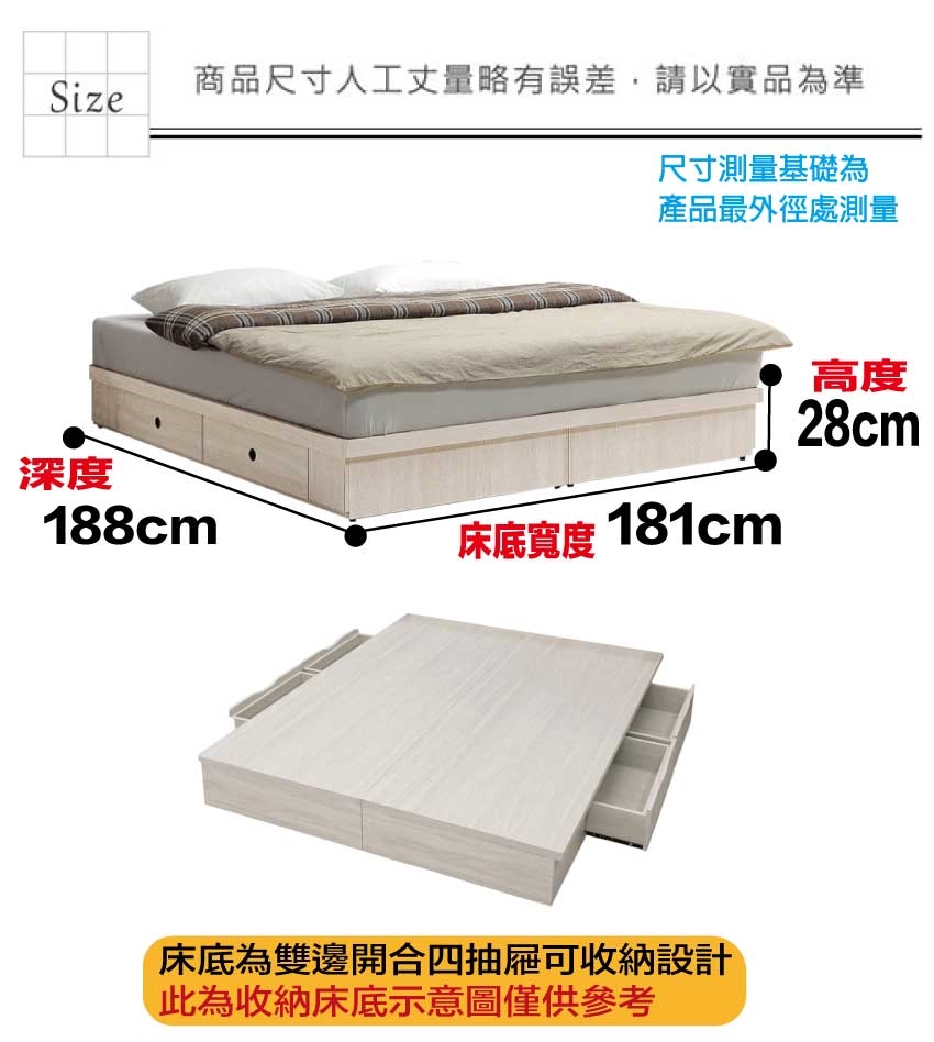 - ◆產品名稱:【綠家居】艾蘿6尺雙人加大四抽床底(不含床墊)