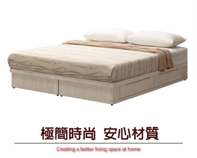 商品介紹 | 【綠家居】額爾 現代5尺雙人四抽床底(不含床墊) 白橡木紋色系+現代簡約風格+安心材質製造,整體採用防蛀木心板+六分木床板等安心材質製造,外層採用優利坦全包式耐磨噴漆處理搭配採用雙邊開合四抽屜床底便利設計,全由專人配送到家,專業安心服務,替你省下更多時間! 【商品特色】 白橡木紋色系+現代簡約風格+安心材質製造,使用放心+搭配居家更便利 採用防蛀木心板+六分木床板等安心材質製造 採用雙邊開合四抽屜床底便利設計 此商品不需要DIY組立,此商品為組立後之成品 品質保證、專業設計、貼心服務 全由專人配送到家,專業安心服務,替您省下更多時間 |