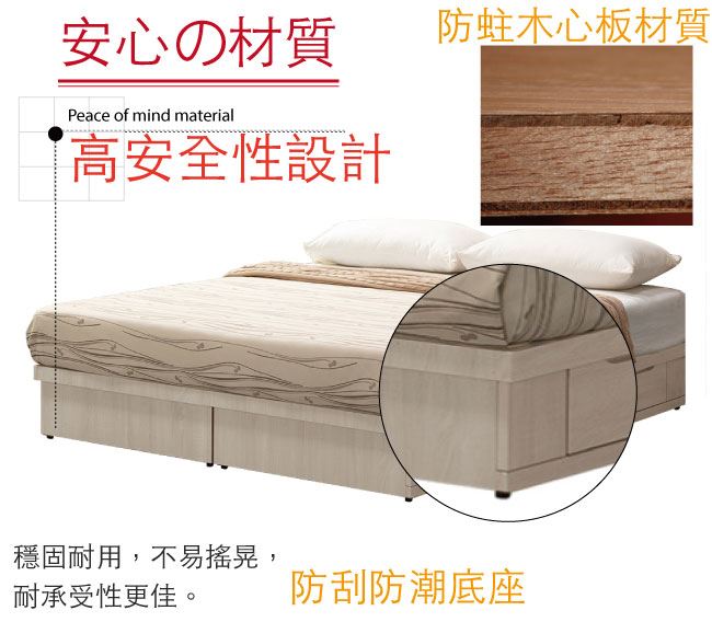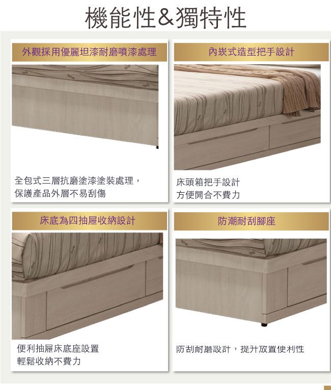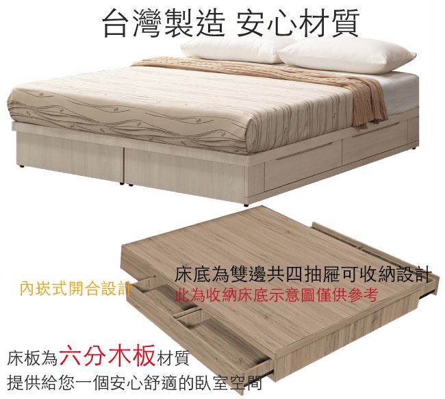 採用雙邊開合四抽屜床底便利設計