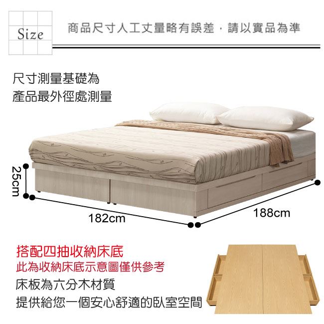 材質 | ◆產品名稱:【綠家居】 額爾 現代6尺雙人加大四抽床底(不含床墊) 產品尺寸: 床底尺寸:(寬)182x(深)188x(高)25/公分 ◆材質: 材質:防蛀木心板+六分木床板 塗漆:優利坦全包式耐磨噴漆處理 |