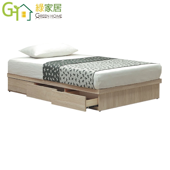 ★偏遠地區需額外加收運費,下標請先問與答詢問★ ★下訂前注意 由於商品流動較快,下訂前請先詢問是否有貨在下訂喔~★ 【綠家居】畢克爾3.5尺單人三抽床底(不含床墊) 橡木紋色系+安心材質製造,使用放心+搭配居家更便利,採用防蛀木心板+防潮耐磨底座+六分木床底等安心材質製造 ,外層採用防潮耐磨噴漆處理搭配床底座單邊開合三抽屜收納空間設計,全由專人配送到家,專業安心服務,替你省下更多時間!