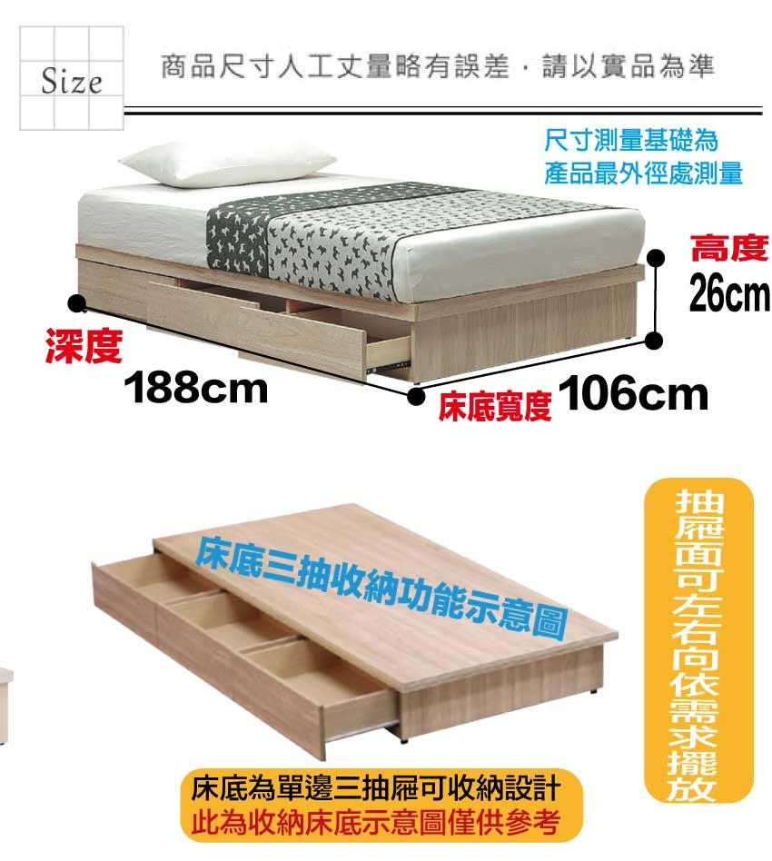 - ◆產品名稱:【綠家居】畢克爾3.5尺單人三抽床底(不含床墊)