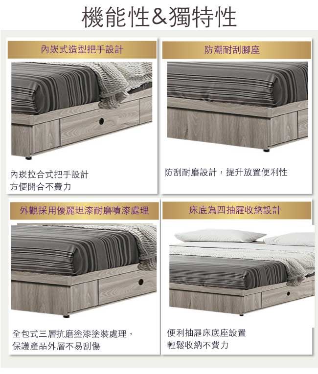 商品 介紹 | 【綠家居】佩芮 現代5尺雙人四抽床底(不含床墊) 橡木紋色系+現代簡約風格+安心材質製造,整體採用防蛀木心板+六分木床板+防潮耐磨底座等安心材質製造,外層採用優利坦全包式耐磨噴漆處理搭配採用雙邊開合收納四抽屜便利設計,全由專人配送到家,專業安心服務,替你省下更多時間! 【商品特色】 橡木紋色系+現代簡約風格+安心材質製造,使用放心+搭配居家更便利 採用防蛀木心板+六分木床板+防潮耐磨底座等安心材質製造 採用雙邊開合收納四抽屜便利設計 此商品不需要DIY組立,此商品為組立後之成品 全由專人配送到家,專業安心服務,替您省下更多時間 |