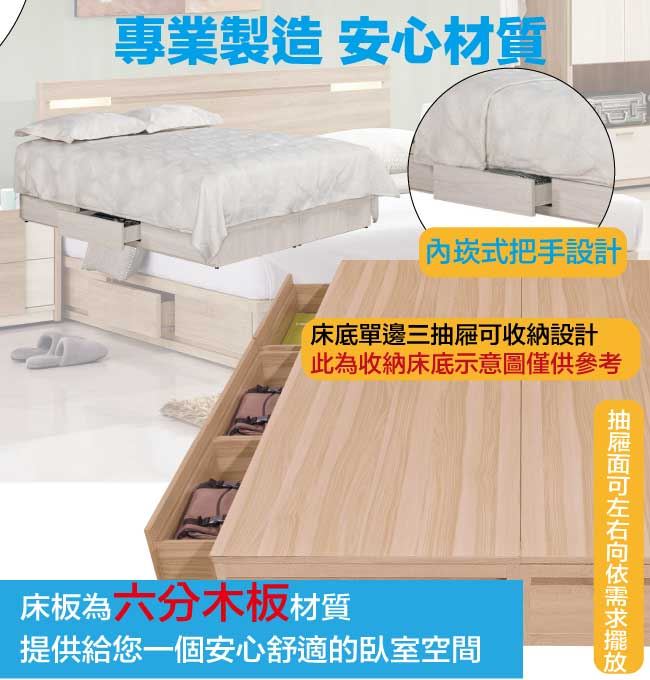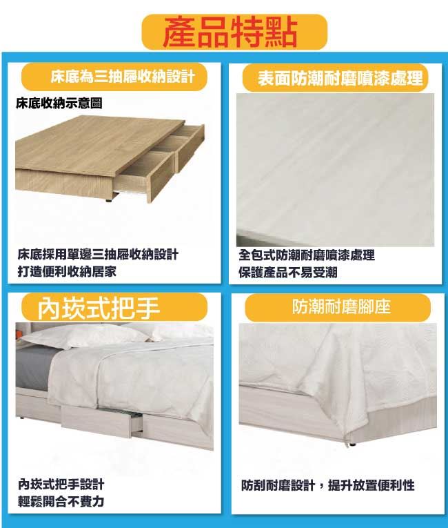 商品 介紹 | 【綠家居】摩克5尺雙人單邊三抽屜床底(不含床墊) 淺橡木紋色系+現代簡約風格+安心材質製造,整體採用防蛀木心板+六分木床板+防潮耐磨腳座等安心材質製造,產品外層採用防潮耐磨噴漆處理搭配採用床底單邊開合三抽屜等收納空間設計,全由專人配送到家,專業安心服務,替你省下更多時間! 【商品特色】 淺橡木紋色系+現代簡約風格+安心材質製造,使用放心+搭配居家更便利 採用防蛀木心板+六分木床板+防潮耐磨腳座等安心材質製造 產品外層採用防潮耐磨噴漆處理 搭配採用床底單邊開合三抽屜等收納空間設計 此商品不需要DIY組立,此商品為組立後之成品 品質保證、專業設計、貼心服務 全由專人配送到家,專業安心服務,替您省下更多時間 |