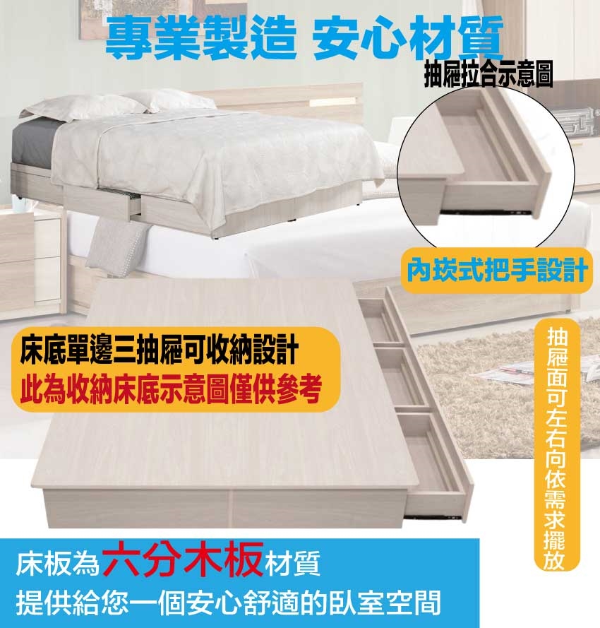 採用防蛀木心板+防潮耐磨底座+六分木床底等安心材質製造