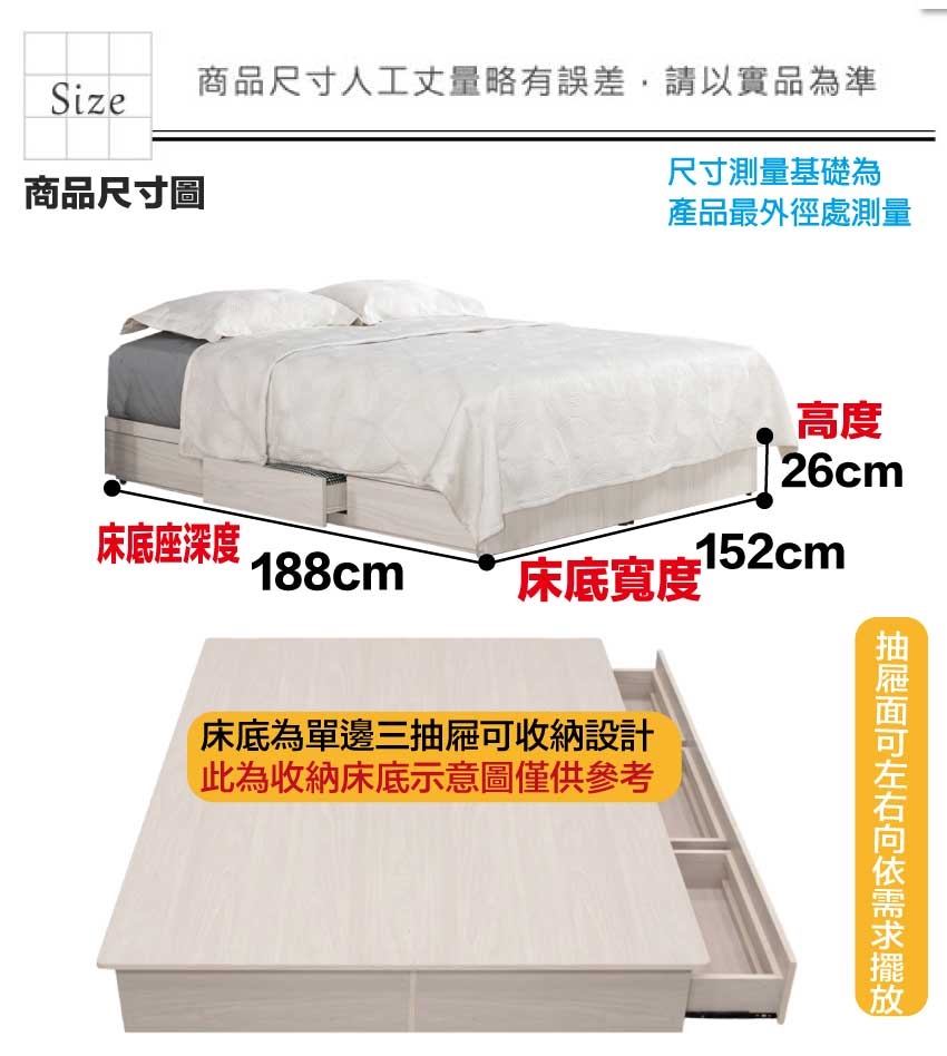 - ◆產品名稱:【綠家居】華爾5尺雙人單邊三抽床底座(不含床墊)