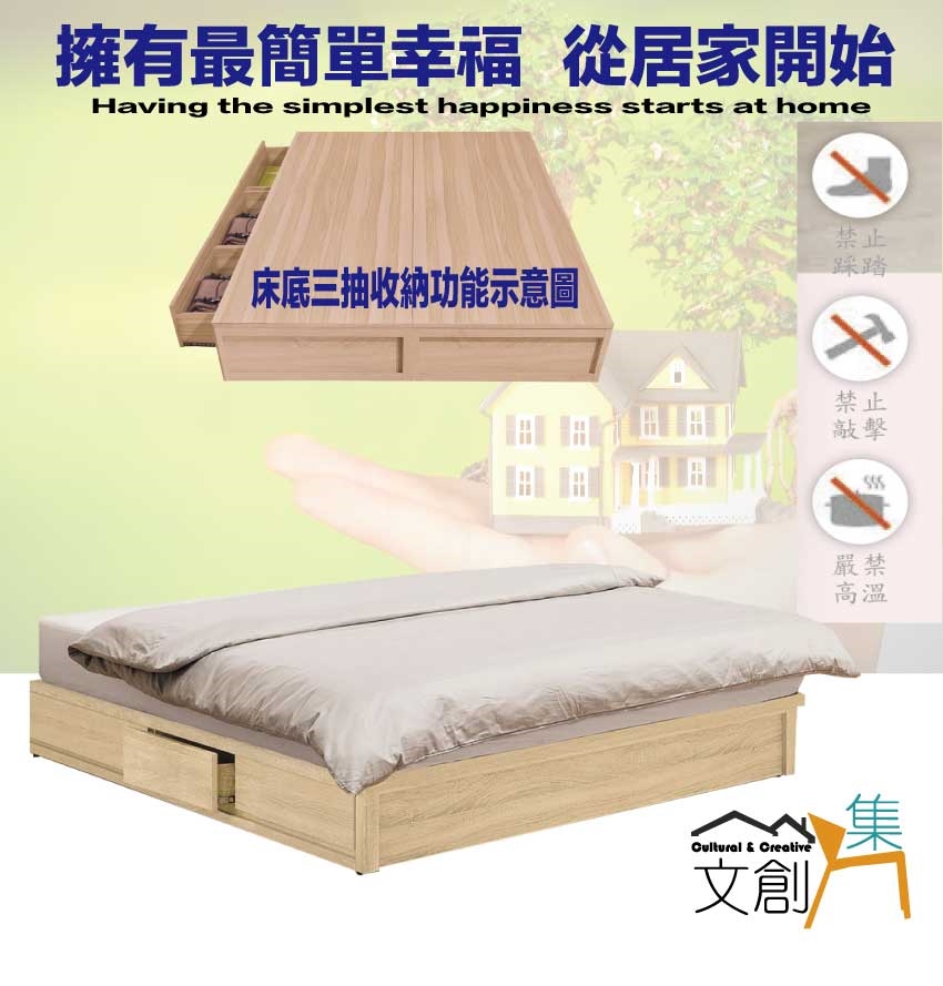 搭配採用床底座單邊開合三抽屜收納空間設計