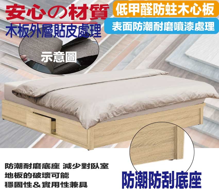 採用防蛀木心板+六分木床板+防潮耐磨底座(可調高低水平)等安心材質製造
