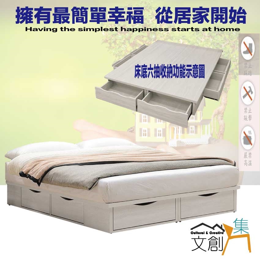 搭配採用床底座三邊開合六抽屜收納空間設計