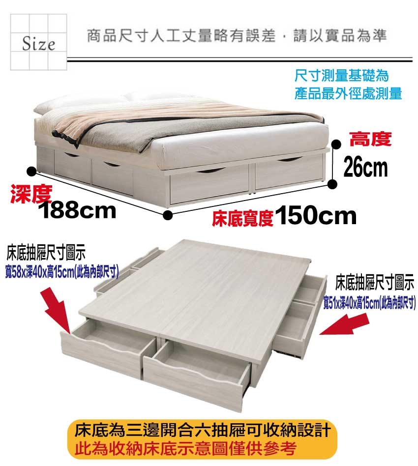 - ◆產品名稱:【綠家居】福登5尺雙人六抽床底座(不含床墊)