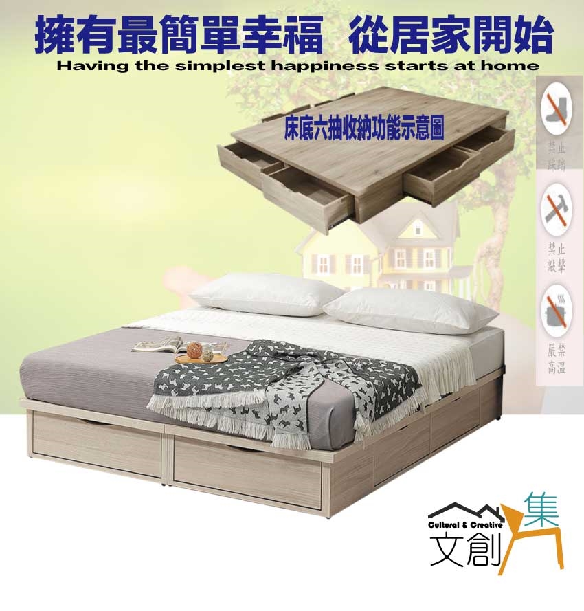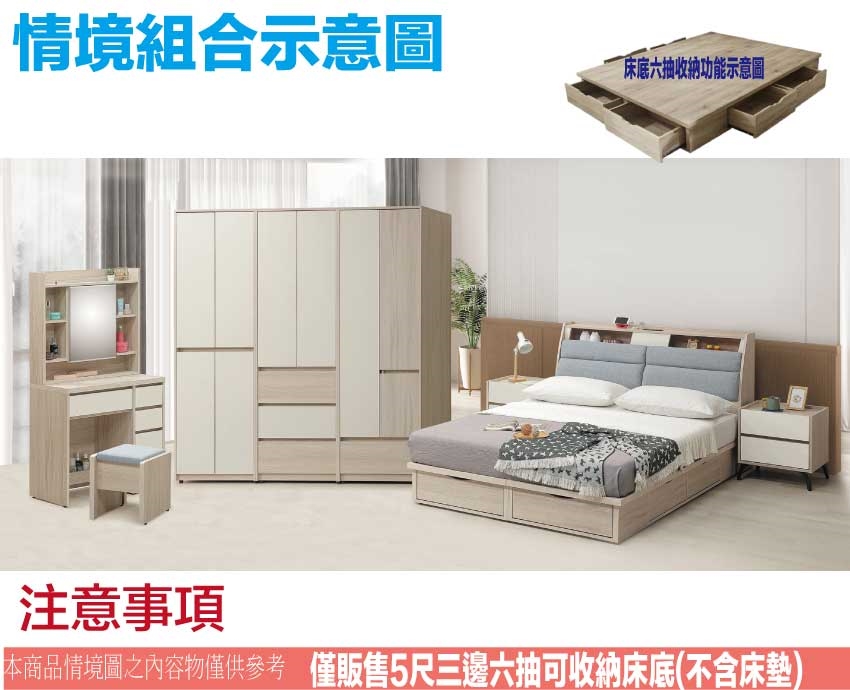 搭配採用床底座三邊開合六抽屜收納空間設計