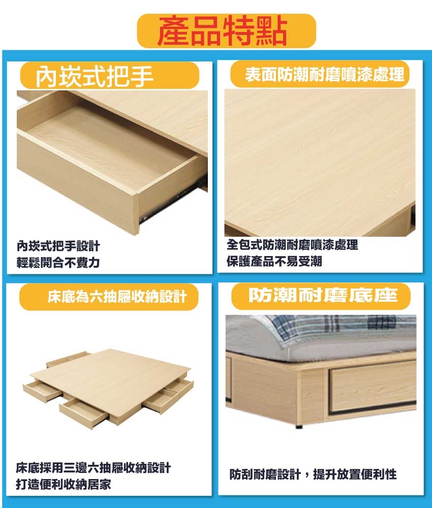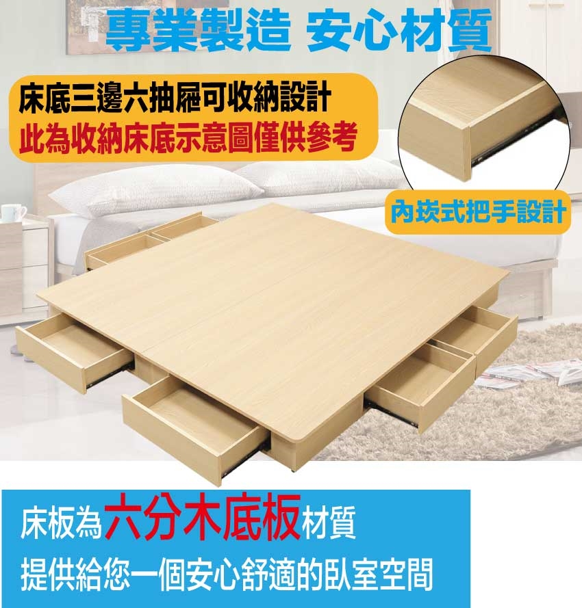 搭配採用床底座三邊開合六抽屜收納空間設計