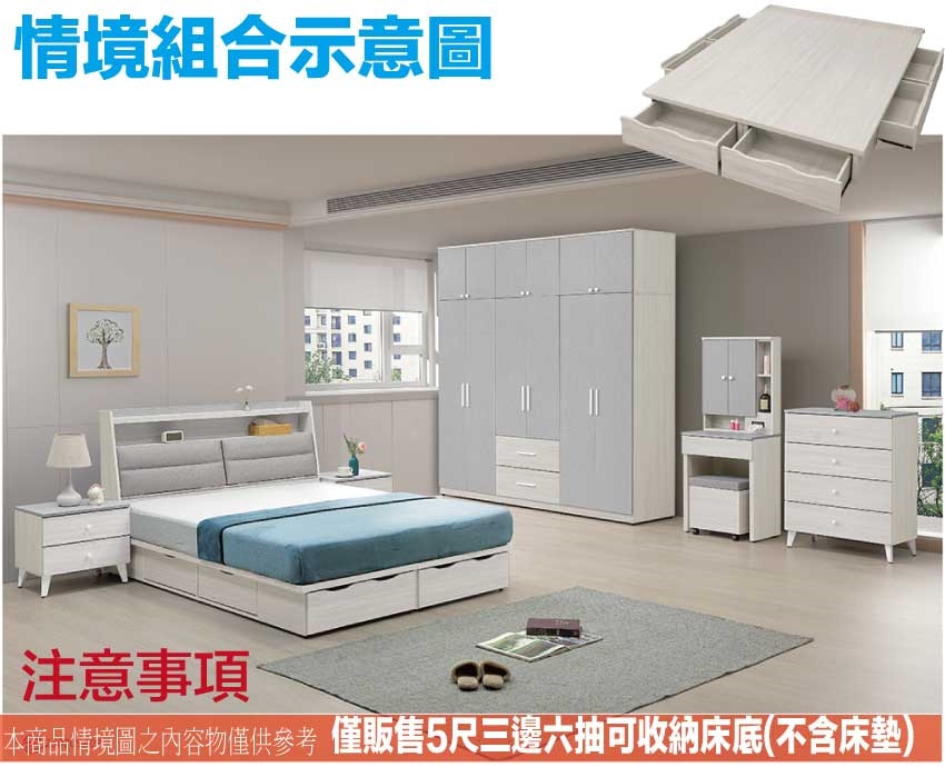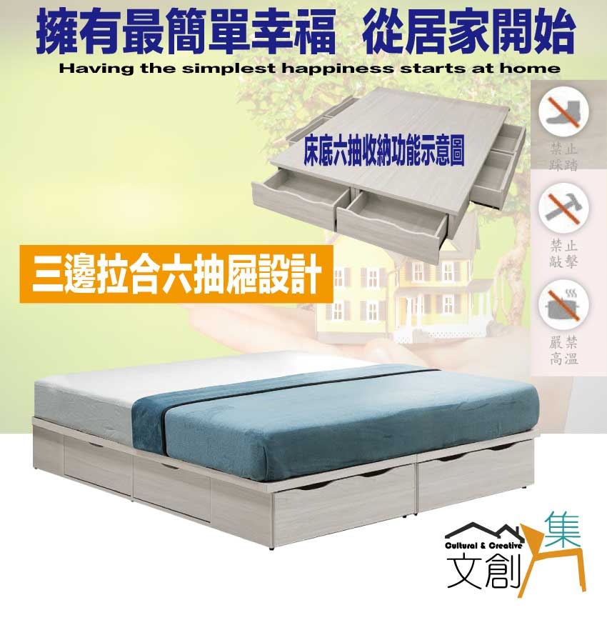 搭配採用床底座三邊開合六抽屜收納空間設計