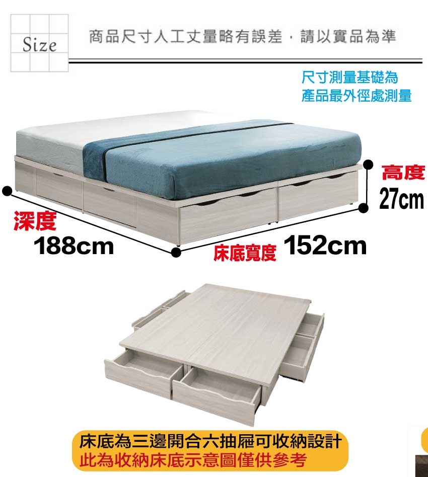 - ◆產品名稱:【綠家居】菲可5尺雙人六抽屜收納床底(不含床墊)