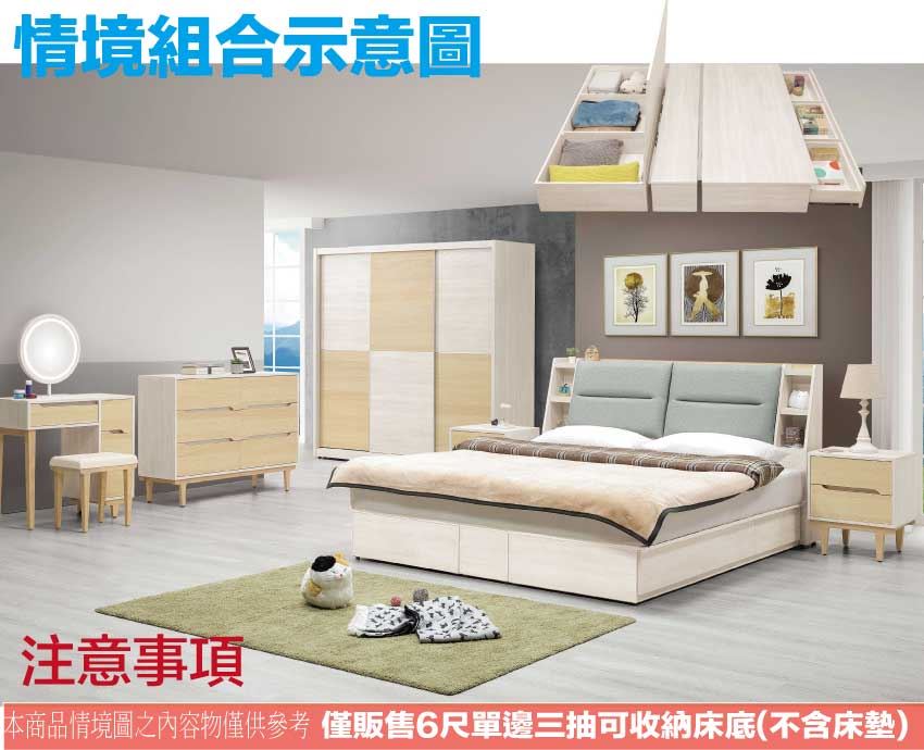 搭配床底座單邊開合三抽屜+床底板可上掀內可置物等收納空間設計