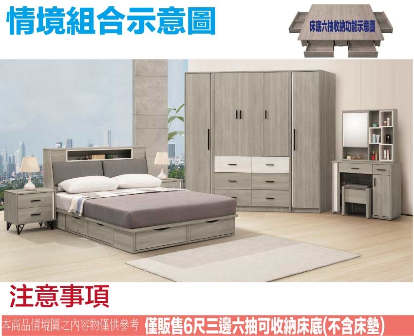 搭配採用床底座三邊開合六抽屜收納空間設計