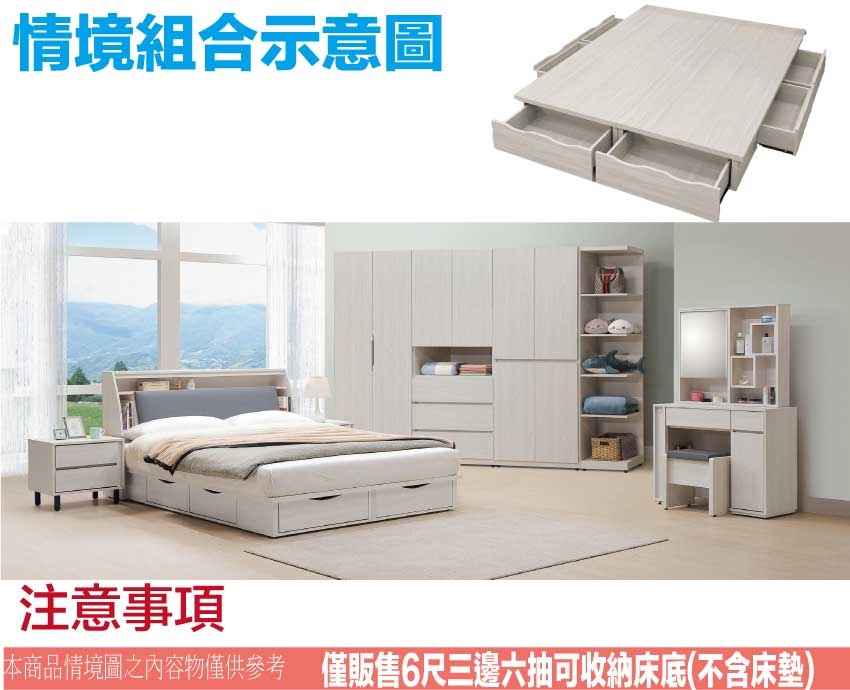 搭配採用床底座三邊開合六抽屜收納空間設計