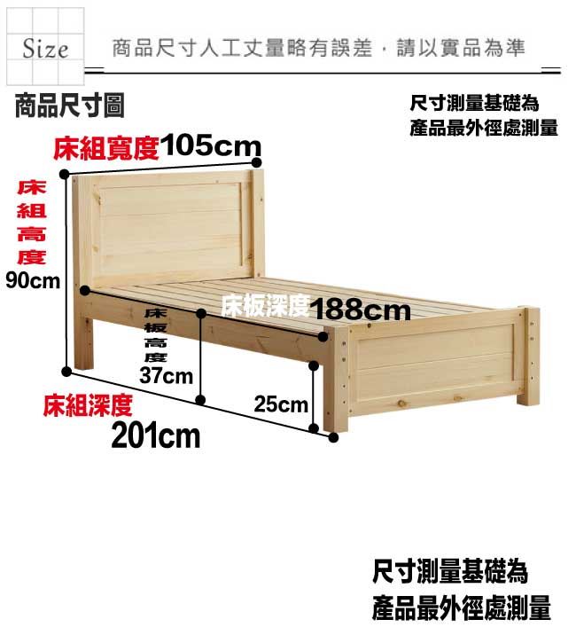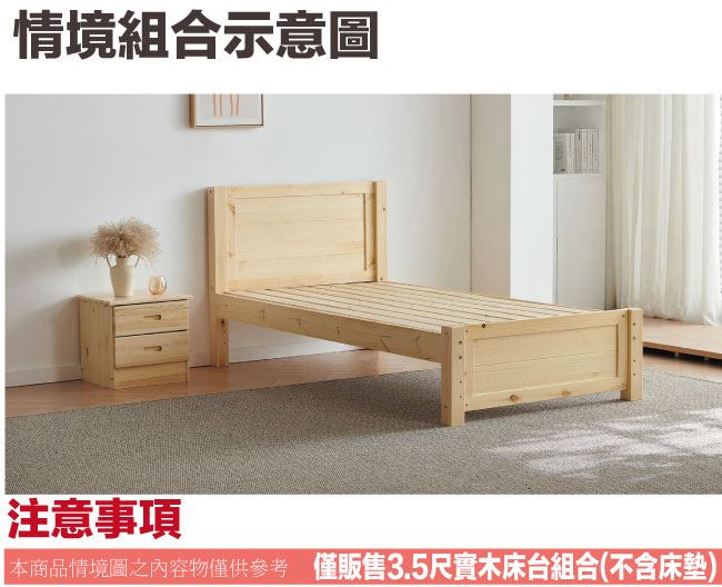 材質 | ◆產品名稱:【綠家居】富士利3.5尺實木單人床台組合 床台組合尺寸:(寬)105x(深)201x(高)90/公分 ◆材質: 材質:松木實木+六分木床底板+防潮實木腳座 噴漆:防潮耐磨噴漆處理 |