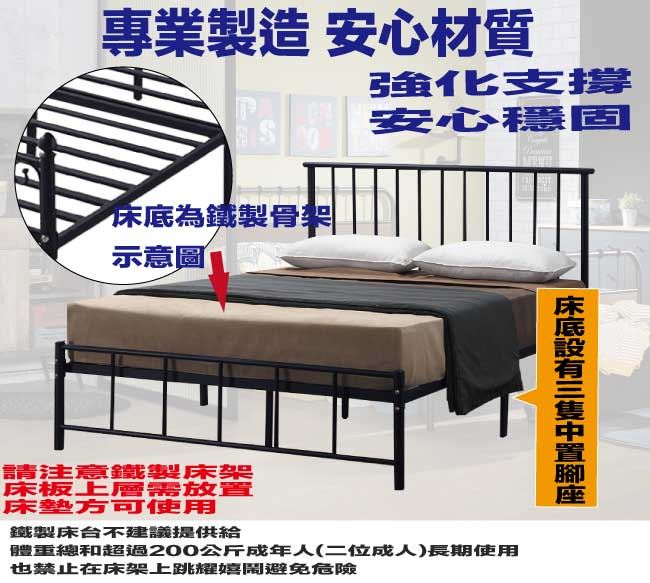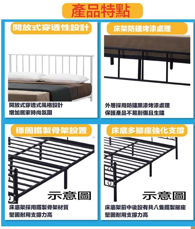 材質 | ◆產品名稱:【綠家居】安琳5尺雙人鐵製床台組合(二色可選) 床台組合尺寸:(寬)151x(深)203x(高)102/公分 ◆材質: 材質:防鏽鐵製床架&骨架+鐵製圓形腳座 噴漆:外層防鏽烤漆處理 |