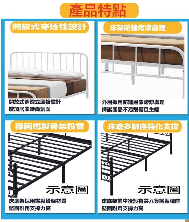 商 品 介 紹 | 【綠家居】希琳5尺雙人鐵製床台組合(二色可選) 二色可選+現代簡約風格+安心材質製造,整體採用防鏽鐵製床架&骨架+鐵製圓形腳座等安心材質製造,產品外層防鏽烤漆處理,全由專人配送到家,專業安心服務,替你省下更多時間! 【商品特色】 二色可選+現代簡約風格+安心材質製造,使用放心+搭配居家更便利 採用防鏽鐵製床架&骨架+鐵製圓形腳座等安心材質製造 產品外層防鏽烤漆處理 此商品不需要DIY組立,此商品為組立後之成品 品質保證、專業設計、貼心服務 全由專人配送到家,專業安心服務,替您省下更多時間