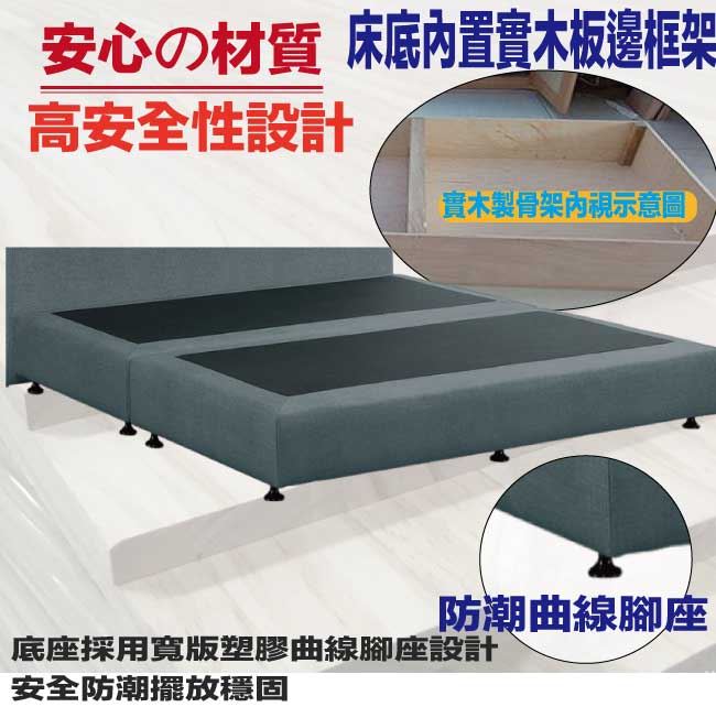 商 品 介 紹 | 【綠家居】巴雅利6尺雙人加大貓抓布紋皮革床底(不含床墊) 北歐雲灰色系+現代簡約風格+安心材質製造,整體採用內置實木框架+防潮曲線腳座+耐磨貓抓亞麻布紋皮革+高回彈泡棉+止滑天鵝絨布等安心材質製造,搭配採用床底導圓邊框設計+平面式雙床底併合設計搭配止滑天鵝絨布面,可讓床墊平穩置放避免破壞結構,並減少床墊位移不穩的困擾,全由專人配送到家,專業安心服務,替你省下更多時間! 【商品特色】 北歐雲灰色系+現代簡約風格+安心材質製造,使用放心+搭配居家更便利 採用內置實木框架+防潮曲線腳座+耐磨貓抓亞麻布紋皮革+高回彈泡棉+止滑天鵝絨布等安心材質製造 搭配採用床底導圓邊框設計+平面式雙床底併合設計搭配止滑天鵝絨布面,可讓床墊平穩置放避免破壞結構,並減少床墊位移不穩的困擾 此商品不需要DIY組立,此商品為組立後之成品 品質保證、專業設計、貼心服務 全由專人配送到家,專業安心服務,替您省下更多時間