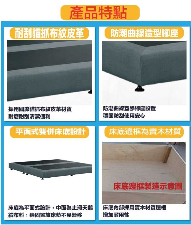材質 | ◆產品名稱:【綠家居】巴雅利6尺雙人加大貓抓布紋皮革床底(不含床墊) 床底尺寸:(寬)182x(深)188(高)26/公分 ◆材質: 材質:內置實木框架+防潮曲線腳座+耐磨貓抓亞麻布紋皮革+高回彈泡棉+止滑天鵝絨布 |