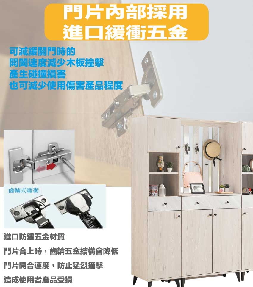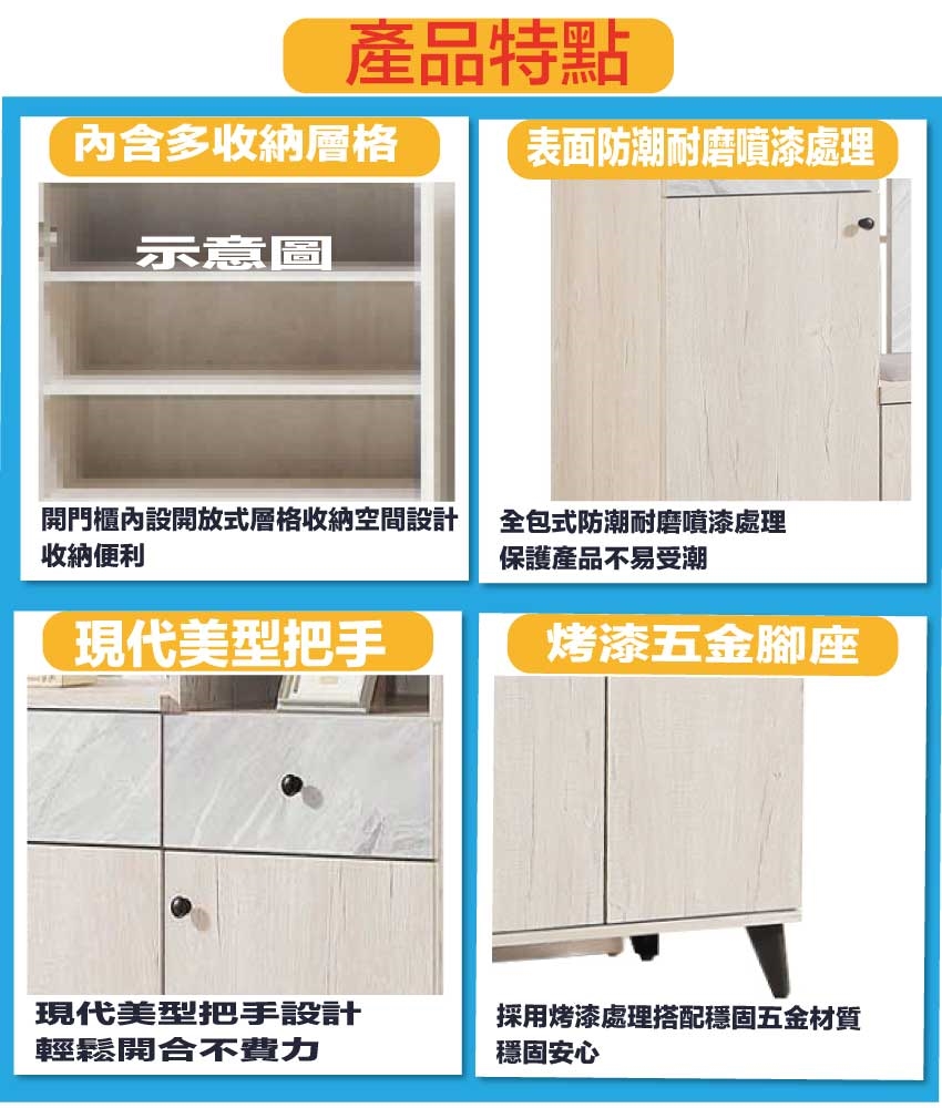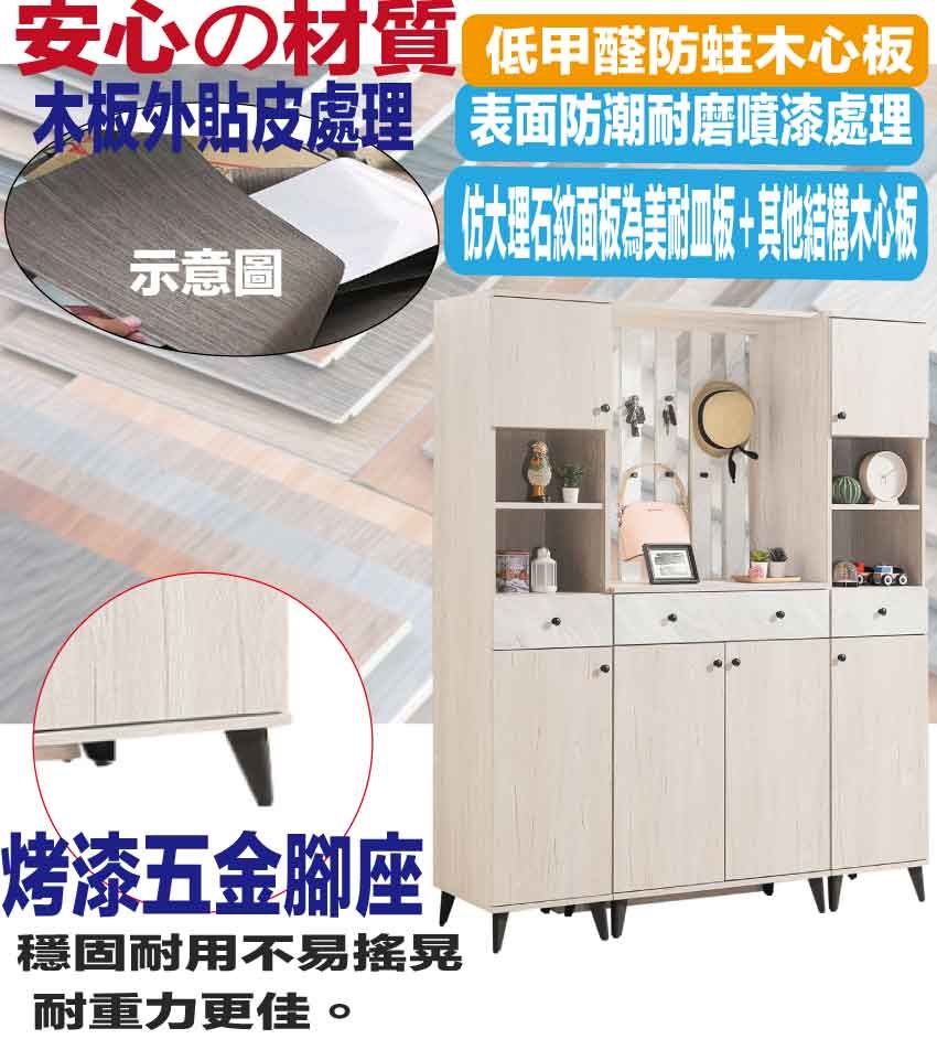採用防蛀木心板+五金滑軌結構+烤漆五金腳座+防夾手緩衝門片五金+仿石紋耐磨美耐皿材質面板等安心材質製造