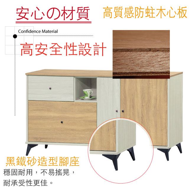材質 | ◆產品名稱:【綠家居】甘托克 現代5尺單抽三門餐櫃/收納櫃(二色可選) 收納櫃尺寸:(寬)150x(深)40.5x(高)80/公分 ◆材質: 材質:防蛀木心板+黑鐵砂腳座+五金滑軌結構+防夾手緩衝門片五金 塗漆:優利坦三層全包式耐磨塗漆塗裝處理 |
