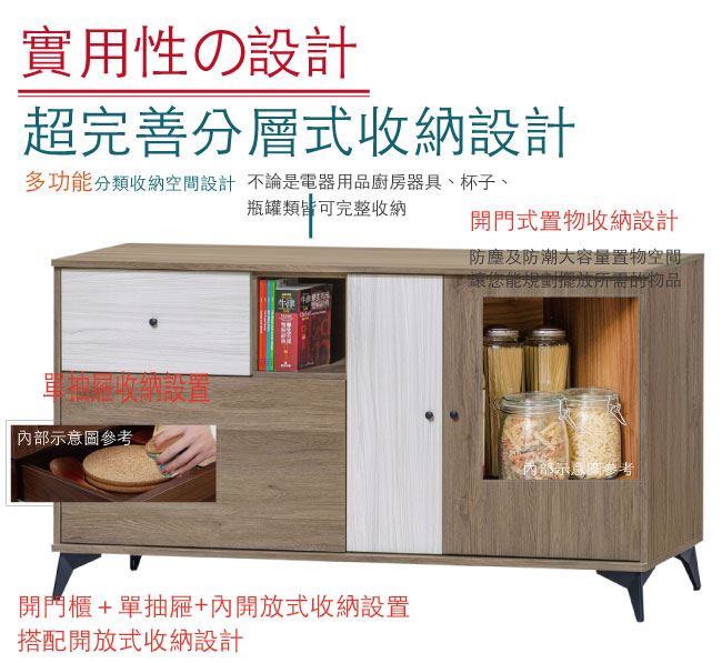 商品介紹 | 【綠家居】甘托克 現代5尺單抽三門餐櫃/收納櫃(二色可選) 二色可選+現代簡約風格+安心材質製造,整體採用防蛀木心板+黑鐵砂腳座+五金滑軌結構+防夾手緩衝門片五金等安心材質製造,外層採用優利坦全包式耐磨噴漆處理搭配採用開單抽屜+開放式層格+開門櫃等收納設計,全由專人配送到家,專業安心服務,替你省下更多時間! 【商品特色】 二色可選+現代簡約風格+安心材質製造,使用放心+搭配居家更便利 採用防蛀木心板+黑鐵砂腳座+五金滑軌結構+防夾手緩衝門片五金等安心材質製造 採用單抽屜+開放式層格+開門櫃等收納設計 此商品不需要DIY組立,此商品為組立後之成品 品質保證、專業設計、貼心服務 全由專人配送到家,專業安心服務,替您省下更多時間 |