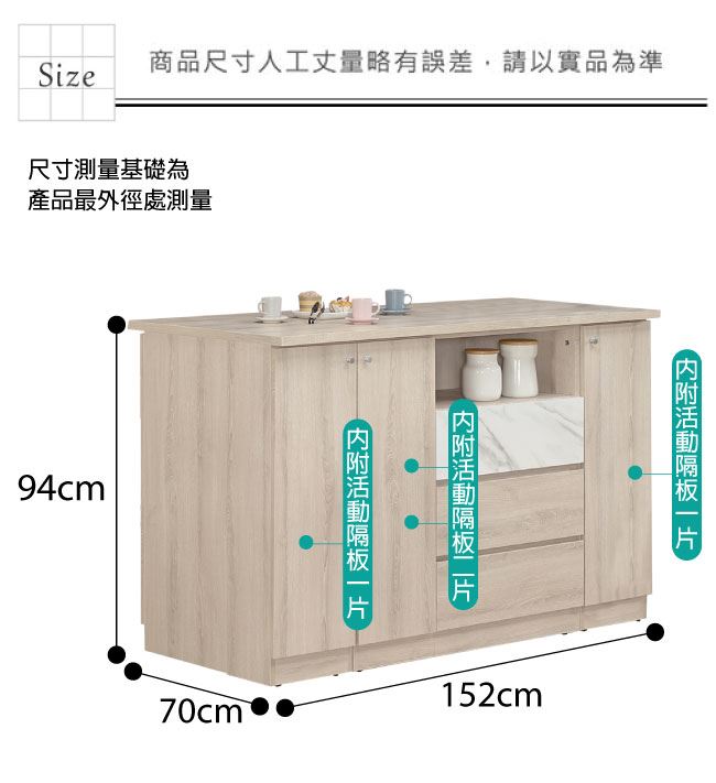 材質 | ◆產品名稱:【綠家居】扎爾 雙色5.1尺三門三抽餐櫃/中島餐桌 尺寸:(寬)152x(深)70x(高)94/公分 ◆材質: 材質:防蛀木心板+五金滑軌結構+防潮耐磨腳座+防夾手緩衝門片五金 |