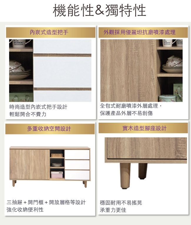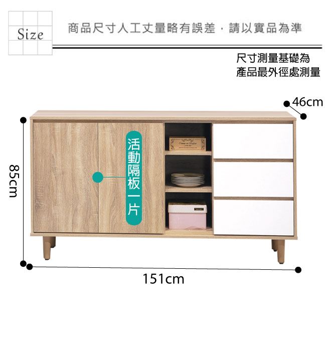 材質 | ◆產品名稱:【綠家居】坦克 現代5尺二門三抽餐櫃/收納櫃 尺寸:(寬)151x(深)46x(高)85/公分 ◆材質: 材質:防蛀木心板+五金滑軌結構+防潮實木腳座+防夾手緩衝門片五金 塗漆:外層採用優莉坦耐磨全包式噴漆處理 |