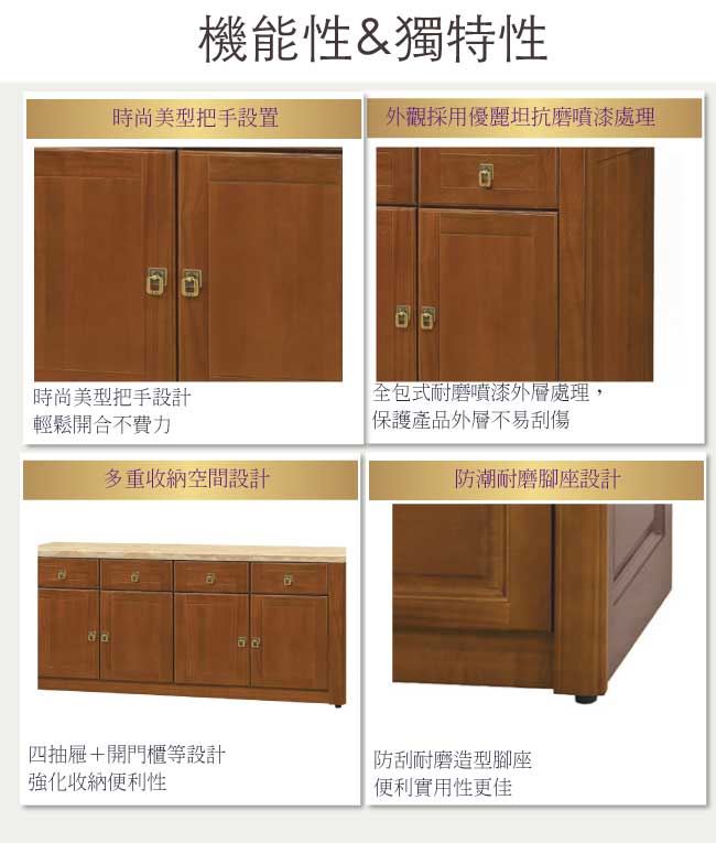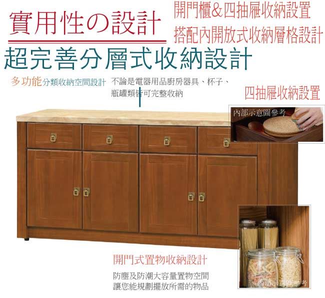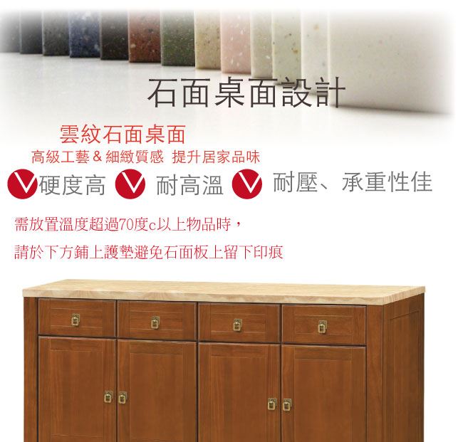 商品介紹 | 【綠家居】布塞爾 樟木紋5.2尺雲紋石面實木餐櫃 樟木紋色系+現代簡約風格+安心材質製造,整體採用樟木實木+松木實木+防蛀木心板+防潮耐磨腳座+五金滑軌結構+2cm雲紋石面板+防夾手緩衝門片五金等安心材質製造,產品外層採用防潮耐磨噴漆處理搭配採用開門櫃+四抽屜+內開放式收納等收納空間設計,全由專人配送到家,專業安心服務,替你省下更多時間! 【商品特色】 樟木紋色系+現代簡約風格+安心材質製造,使用放心+搭配居家更便利 採用樟木實木+松木實木+防蛀木心板+防潮耐磨腳座+五金滑軌結構+2cm雲紋石面板+防夾手緩衝門片五金等安心材質製造 產品外層採用防潮耐磨噴漆處理 搭配採用開門櫃+四抽屜+內開放式收納等收納空間設計 此商品不需要DIY組立,此商品為組立後之成品 品質保證、專業設計、貼心服務 全由專人配送到家,專業安心服務,替您省下更多時間 |