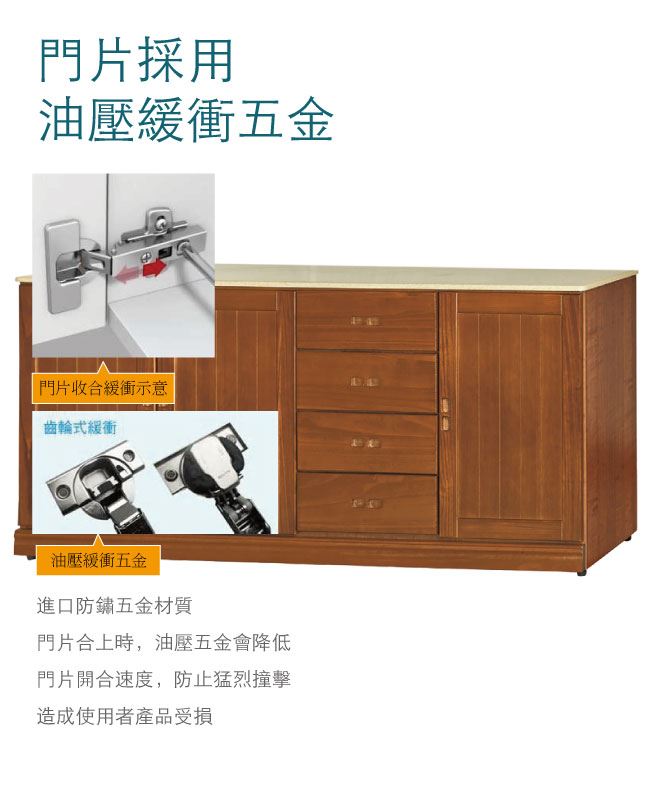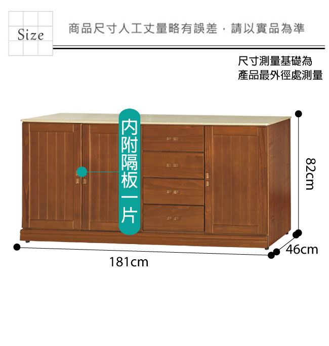 材質 | ◆產品名稱: 【綠家居】塞依爾 樟木紋6尺雲紋石面實木餐櫃 尺寸:(寬)181x(深)46x(高)82/公分 ◆材質: 材質:松木實木+防蛀木心板+防潮耐磨腳座+五金滑軌結構+12mm雲紋石面板+防夾手緩衝門片五金 噴漆:防潮耐磨噴漆處理