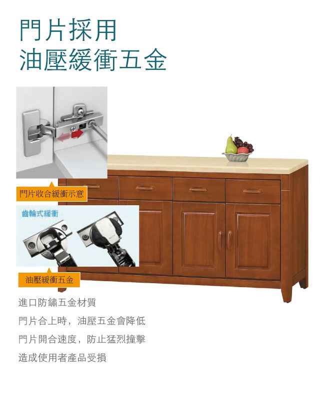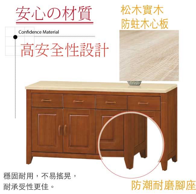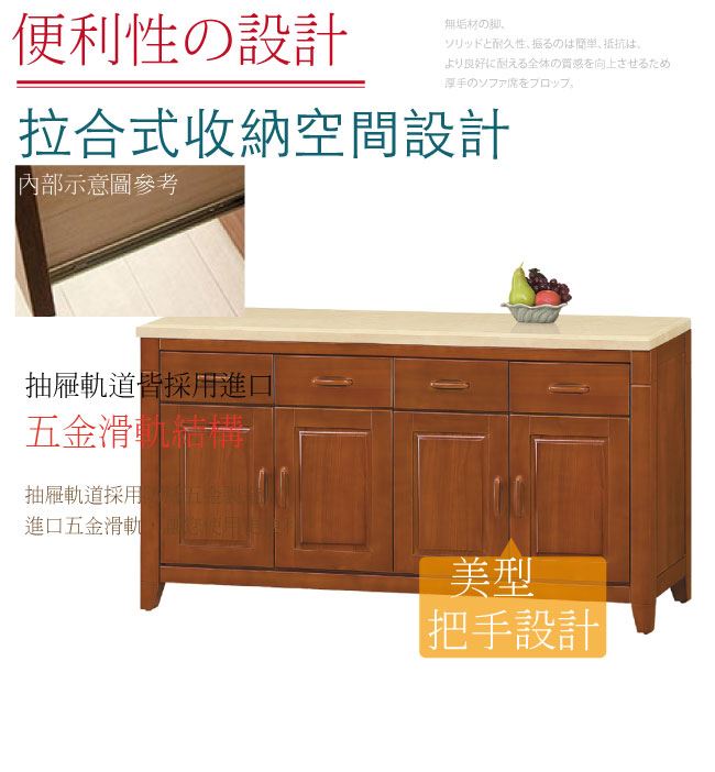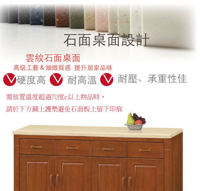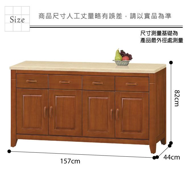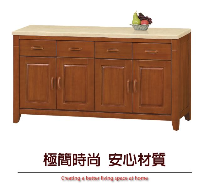 材質 | ◆產品名稱: 【綠家居】波賽多 樟木紋5.2尺雲紋石面實木餐櫃 尺寸:(寬)157x(深)44x(高)82/公分 ◆材質: 材質:松木實木+防蛀木心板+防潮耐磨腳座+五金滑軌結構+2cm雲紋石面板+防夾手緩衝門片五金 噴漆:防潮耐磨噴漆處理