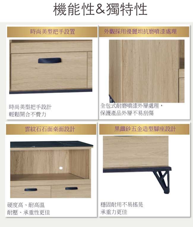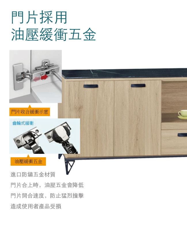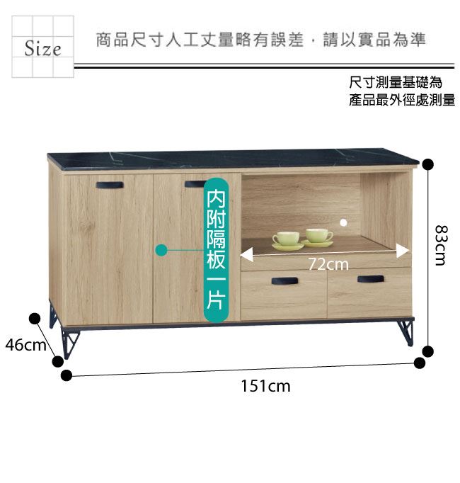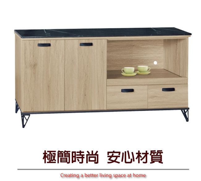材質 | ◆產品名稱: 【綠家居】哈立爾 橡木紋5尺拉盤雲紋石面餐櫃 尺寸:(寬)151x(深)46x(高)83/公分 ◆材質: 材質:防蛀木心板+黑鐵砂腳座+五金滑軌結構+12mm雲紋石面板+防夾手緩衝門片五金 噴漆:防潮耐磨噴漆處理