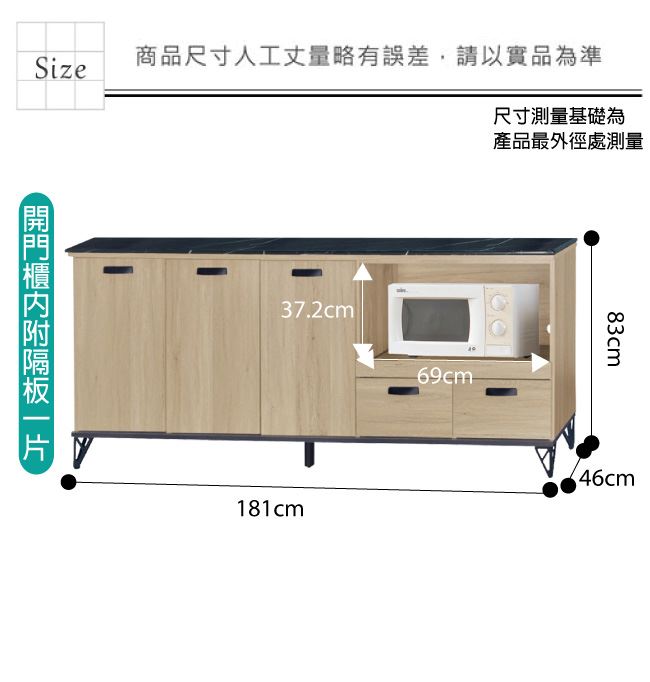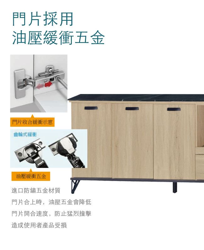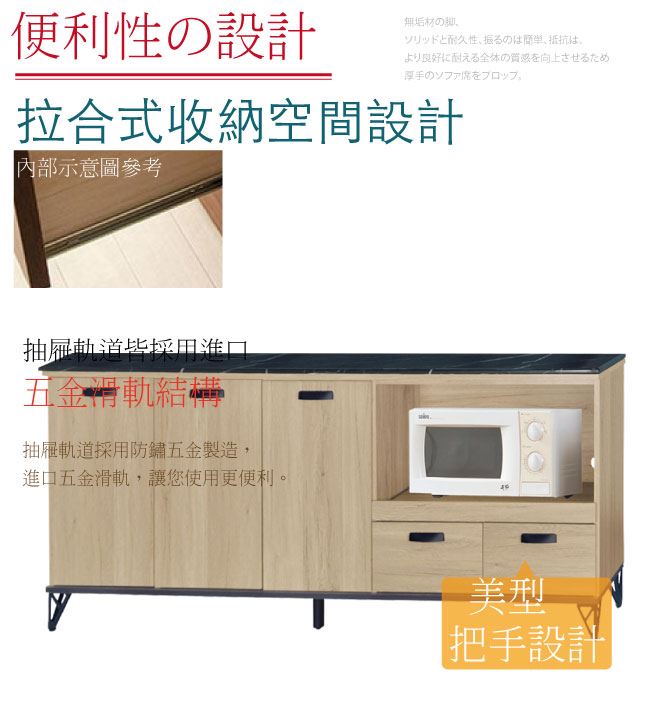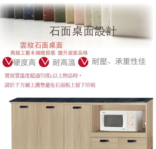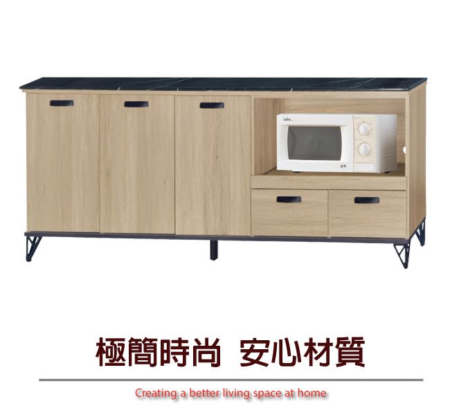 材質 | ◆產品名稱: 【綠家居】哈立爾 橡木紋6尺拉盤雲紋石面餐櫃 尺寸:(寬)181x(深)46x(高)83/公分 ◆材質: 材質:防蛀木心板+黑鐵砂腳座+五金滑軌結構+12mm雲紋石面板+防夾手緩衝門片五金 噴漆:防潮耐磨噴漆處理