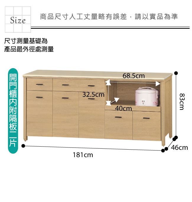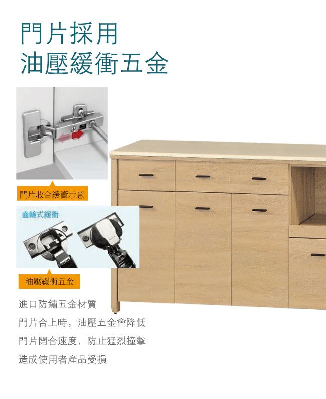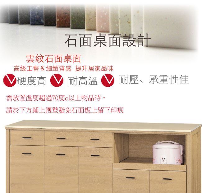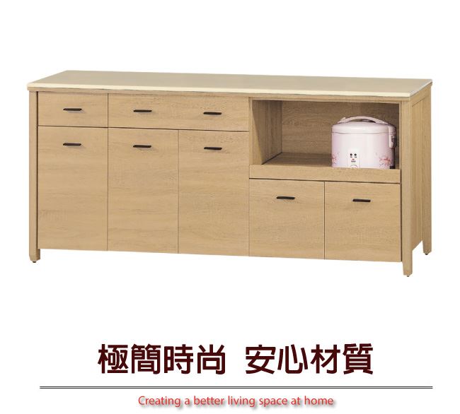 材質 | ◆產品名稱: 【綠家居】巴哈爾 橡木紋6尺拉盤雲紋石面餐櫃 尺寸:(寬)181(深)46x(高)83/公分 ◆材質: 材質:防蛀木心板+防潮耐磨腳座+五金滑軌結構+12mm雲紋石面板+防夾手緩衝門片五金 噴漆:防潮耐磨噴漆處理