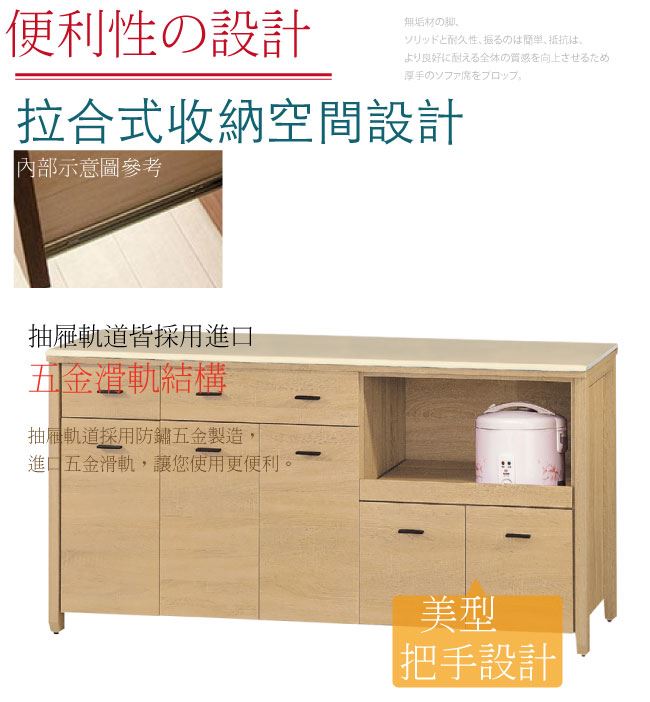 商品介紹 | 【綠家居】巴哈爾 橡木紋6尺拉盤雲紋石面餐櫃 橡木紋色系+現代簡約風格+安心材質製造,整體採用防蛀木心板+防潮耐磨腳座+五金滑軌結構+12mm雲紋石面板+防夾手緩衝門片五金等安心材質製造,產品外層採用防潮耐磨噴漆處理搭配採用開門櫃+四抽屜+拉合式拉盤層架+開放式收納等收納空間設計,全由專人配送到家,專業安心服務,替你省下更多時間! 【商品特色】 橡木紋色系+現代簡約風格+安心材質製造,使用放心+搭配居家更便利 採用防蛀木心板+防潮耐磨腳座+五金滑軌結構+12mm雲紋石面板+防夾手緩衝門片五金等安心材質製造 產品外層採用防潮耐磨噴漆處理 搭配採用開門櫃+四抽屜+拉合式拉盤層架+開放式收納等收納空間設計 此商品不需要DIY組立,此商品為組立後之成品 品質保證、專業設計、貼心服務 全由專人配送到家,專業安心服務,替您省下更多時間 |