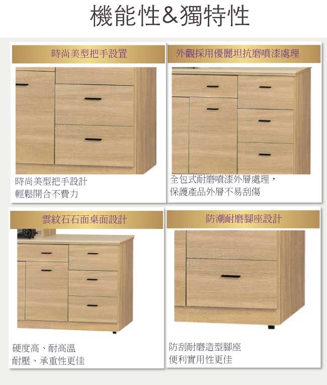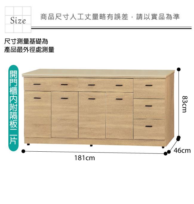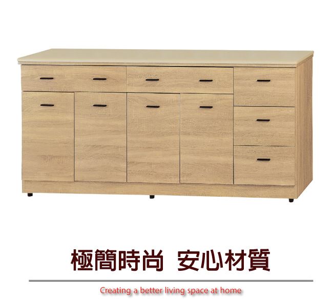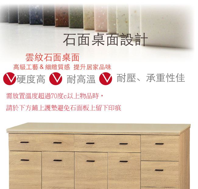 材質 | ◆產品名稱: 【綠家居】巴哈爾 五抽6尺木紋雲紋石面餐櫃 尺寸:(寬)181(深)46x(高)83/公分 ◆材質: 材質:防蛀木心板+防潮耐磨腳座+五金滑軌結構+12mm雲紋石面板+防夾手緩衝門片五金 噴漆:防潮耐磨噴漆處理
