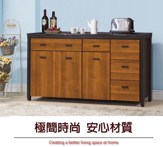 商品介紹 | 【綠家居】海森 雙色5尺雲紋石面餐櫃 木紋雙色系+現代簡約風格+安心材質製造,整體採用防蛀木心板+防潮黑漆腳座+五金滑軌結構+12mm雲紋石面板+防夾手緩衝門片五金等安心材質製造,產品外層採用防潮耐磨噴漆處理搭配採用開門櫃+五抽屜+開放式收納等收納空間設計,全由專人配送到家,專業安心服務,替你省下更多時間! 【商品特色】 木紋雙色系+現代簡約風格+安心材質製造,使用放心+搭配居家更便利 採用防蛀木心板+防潮黑漆腳座+五金滑軌結構+12mm雲紋石面板+防夾手緩衝門片五金等安心材質製造 產品外層採用防潮耐磨噴漆處理 搭配採用開門櫃+五抽屜+開放式收納等收納空間設計 此商品不需要DIY組立,此商品為組立後之成品 品質保證、專業設計、貼心服務 全由專人配送到家,專業安心服務,替您省下更多時間 |