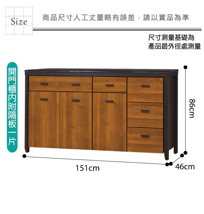 材質 | ◆產品名稱: 【綠家居】海森 雙色5尺雲紋石面餐櫃 尺寸:(寬)151(深)46x(高)86/公分 ◆材質: 材質:防蛀木心板+防潮黑漆腳座+五金滑軌結構+12mm雲紋石面板+防夾手緩衝門片五金 噴漆:防潮耐磨噴漆處理