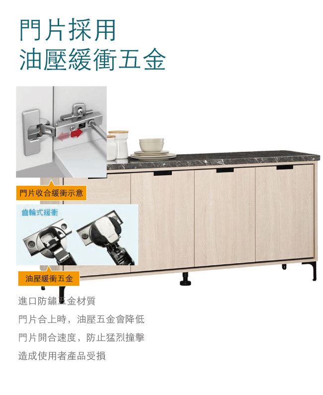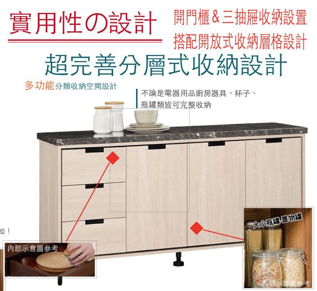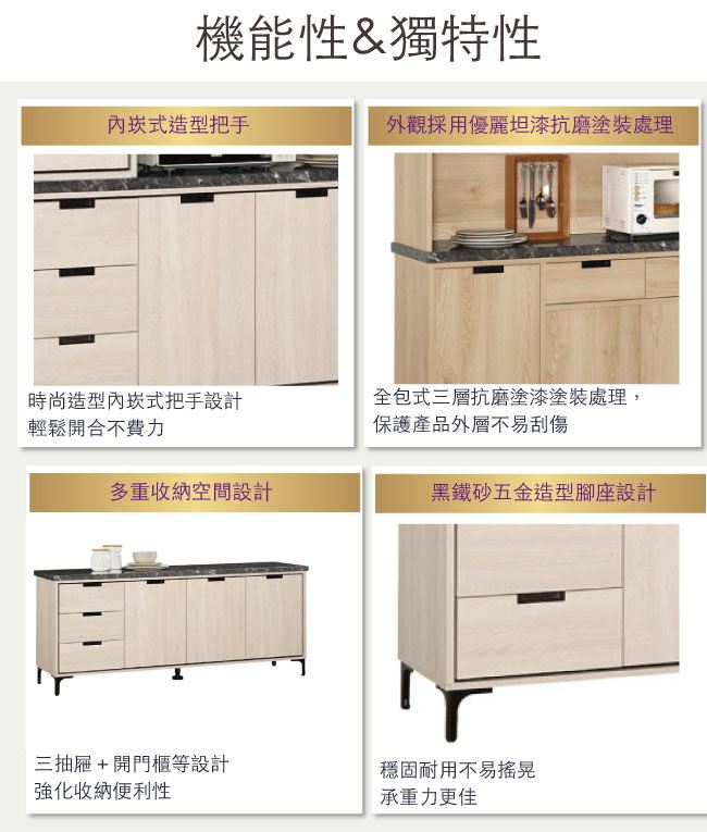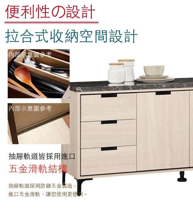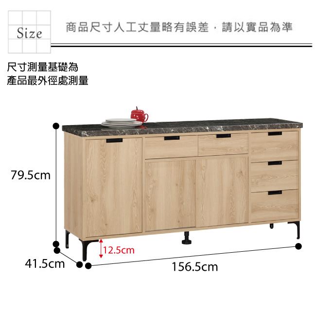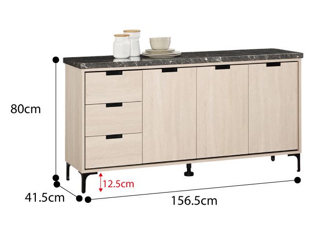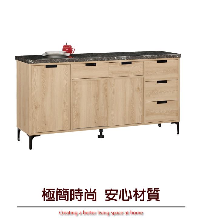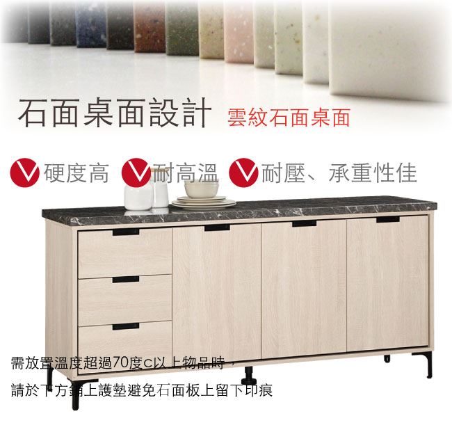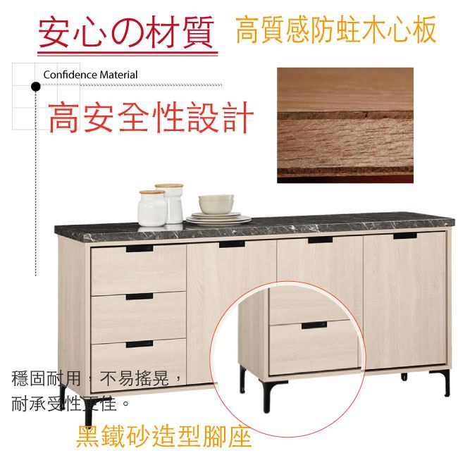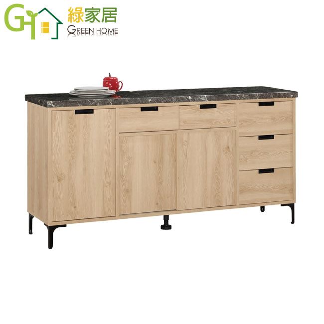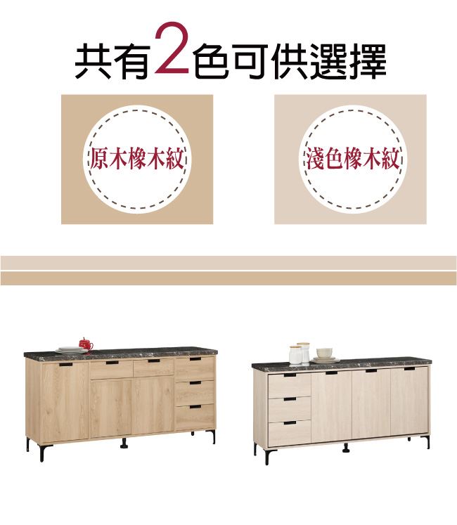 材質 | ◆產品名稱: 【綠家居】艾尼達 時尚5.2尺雲紋石面餐櫃(二色可選) 原橡木紋尺寸:(寬)156.5x(深)41.5x(高)79.5/公分 淺橡木紋尺寸:(寬)156.5x(深)41.5x(高)80/公分 ◆材質: 材質:防蛀木心板+ 黑鐵砂腳座+五金滑軌結構+2cm雲紋石面板+防夾手緩衝門片五金 噴漆:防潮耐磨噴漆處理